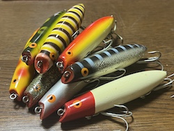 | このニップアイディディーも発泡製のモデルを好んで使用していました。浮力が高く非常にライブリーにアクションし、簡単に首を振らせることができます。3フックでフッキングも抜群で、オールドルアーの中でも取り分け良く釣れるルアーであることは、広く知られていますが、あまり大型狙いには向いていないようです。近年は、あまり出番が無いのが現状です。 | ||