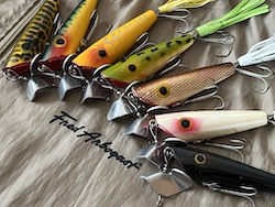 | アウトフィッターズのツイスター。ウッド製の中空ボディで高い浮力を持ち、テールのメタルプレートとブレードとの反響によって、かん高い金属音を発します。目黒のオールドルアーショップ、オールドメモリーズのオリジナルブランド、アートフィジカルベイト・バスリカー。軽めのアクションとボディのメタリックシールがキラキラとアピールします。そして名古屋のトップウォーターフリーク、フライヤーズのRot.No.1000、クリアボディと内蔵したメタルプレートが、独特な雰囲気を醸し出しています。 | ||